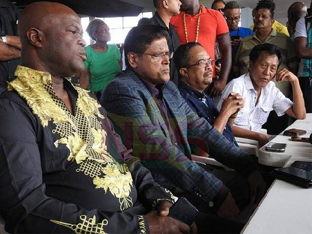Gregory Rusland (NPS), Chandrikapersad Santokhi (VHP), Ronnie Brunswijk (Abop) en Salam Somohardjo (PL) tekenen het samenwerkingsakkoord. Foto: Regillio Derby