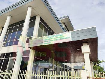 Krishna Mathoera van de VHP (zittend) wordt geïnterviewd na de eerste openbare zitting van het hoofdstembureau Paramaribo. Foto: Irvin Ngariman