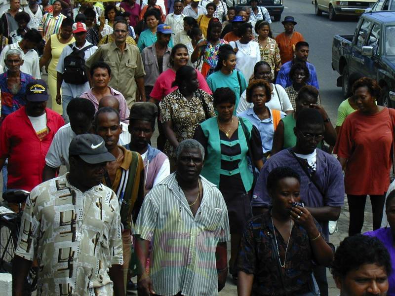 Stakende ambtenaren onder leiding van vakbondsvoorzitter Ronald Hooghart (m) in de straten van Paramaribo, Suriname op woensdag 28 juli, 1999.